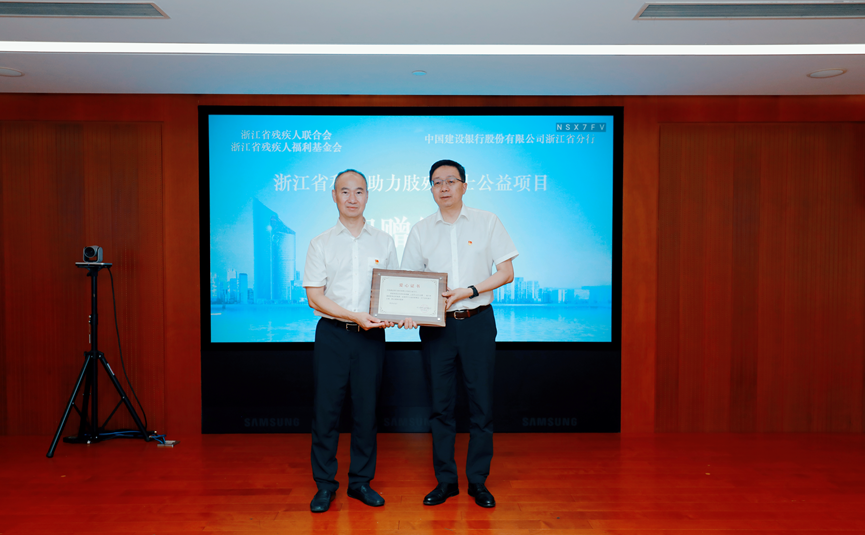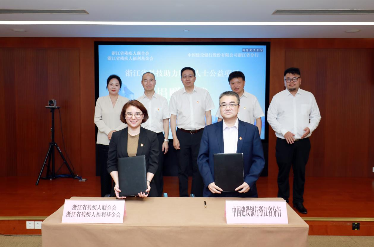 8月7日下午,中国建设银行浙江省分行与浙江省残疾人联合会在省分行大楼举行“浙江省科技助力肢残人士公益项目”捐赠仪式。在建行浙江省分行邵斌行长、浙江省残疾人联合会吕林理事长、浙江广播电视集团郭庆副总编辑,浙江图灵算力研究院孔小仙理事长、浙江强脑科技有限公司韩璧丞创始人见证下,建行浙江省分行邓波副行长和浙江省残疾人福利基金会赵小飞理事长分别代表双方进行签约。建行浙江省分行郑浩副行长、叶进副行长兼杭州分行行长、陈欣捷副行长,公司业务部、机构业务部、投资银行业务部、个人金融部(消费者权益保护部)、私人银行部、渠道与运营管理部、公共关系与企业文化部(党委宣传部)、机关党委相关负责人参加本次仪式。